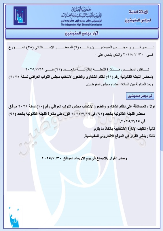وبحسب وثيقة وردت للوكالة العراقية الاخبارية الدولية، قررت المفوضية المصادقة على نظام الشكاوى والطعون للانتخابات البرلمانية 2025، وتكليف الإدارة الانتخابية باتخاذ ما يلزم.