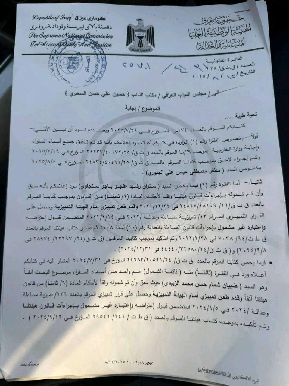 وفي ما يتعلق بالفقرة الثانية من الاستفسار النيابي، أكدت الهيئة أن السفير سلوان رشيد عنجو باجو سنجاوي سبق أن شُمل بإجراءات قانون المساءلة وفق المادة (6/ثامناً)، لكنه قدّم طعنًا تمييزيًا أمام الهيئة التمييزية، وحصل على قرار لصالحه بالعدد 43 تمييزية لعام 2022، يقضي بعدم شموله بالإجراءات، وهو ما جرى تأكيده في كتب لاحقة للهيئة خلال عامي 2022 و2024.