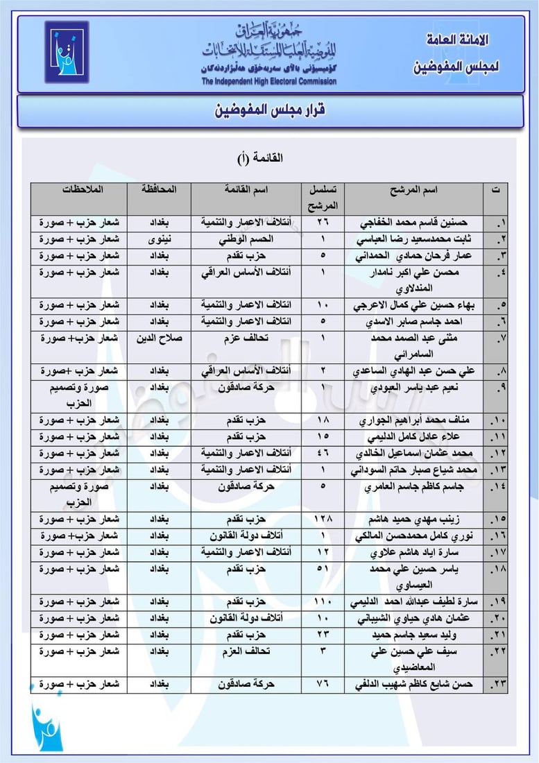 أعلنت المفوضية العليا المستقلة للانتخابات في العراق، اليوم الخميس، فرض غرامات مالية على 23 مرشحاً للانتخابات البرلمانية، بينهم شخصيات سياسية بارزة، و6 تحالفات سياسية بسبب مخالفتهم الضوابط والتعليمات المعتمدة.