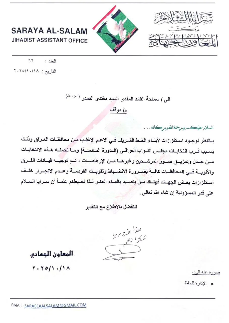 نُشر فيالمحلية الصدر يوجّه سرايا السلام بالانضباط وتجنّب الاستفزازات تمّ النشر بواسطة admin أكتوبر 18, 2025 وجه زعيم التيار الوطني الشيعي مقتدى الصدر، اليوم السبت، سرايا السلام بالانضباط وتفويت الفرصة وعدم الانجرار خلف الاستفزازات، على خلفية ما تشهده بعض المحافظات من توترات قبيل الانتخابات البرلمانية المقبلة. admin عرض كل المقالات تصفّح المقالات المقالة السابقة خبير اقتصادي: الكويت وقطر تمنعان العراق من تأسيس شركة اتصالات وطنيةالمقالة التاليةنائب:حكومة 2026 ستكون حكومة تصريف أعمال