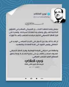 وكتب المالكي في حسابه عبر منصة إكس: “نرفض رفضًا قاطعًا التدخل الأمريكي السافر في الشؤون الداخلية للعراق، ونعتبره انتهاكًا لسيادته ومخالفًا للنظام الديمقراطي في العراق بعد العام 2003، وتعديًا على قرار الإطار التنسيقي لاختيار مرشحه لمنصب رئاسة الوزراء”.